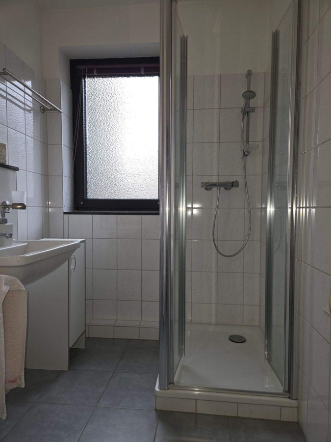 Flur, Bad mit Dusche und Fenster, Schlafzimmer, Wohnzimmer mit Essplatz.